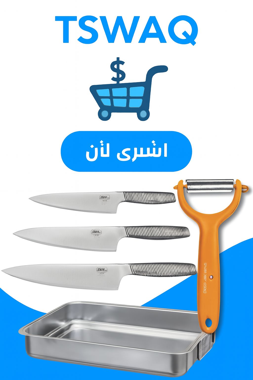 طقم سكاكين 3 قطع من ايكيا IKEA و صينية فرن, ستينلس ستيل, 34x24 سم و قشارة طماطم وكيوي بحافة مسننة من فيكتورينوكس، برتقالي
